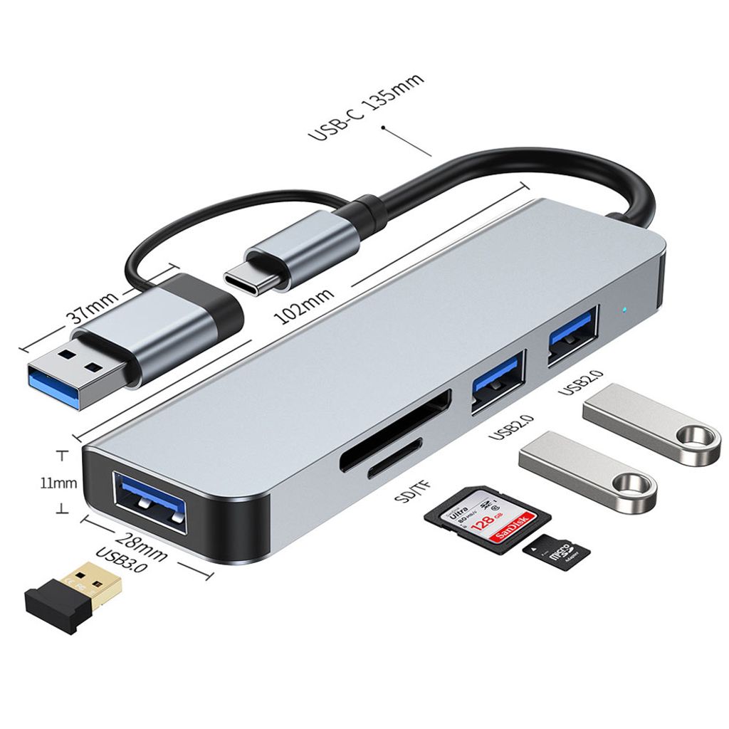 Denna 5-i-1 USB 3.0 och USB-C adapter är en praktisk och bärbar lösning för att utöka anslutningsmöjligheterna på din laptop, surfplatta eller annan enhet med USB-C eller USB 3.0-port. Perfekt för arbete, resor och hemmabruk, där du behöver ansluta flera enheter samtidigt.