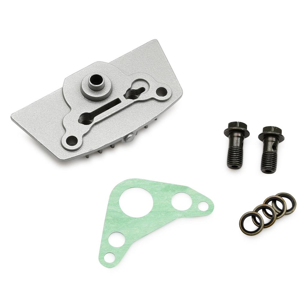 Adapterplatta / platta för att kunna koppla in slangarna från en oljekylare. Engelska benämningen är: Oil Cooler Adapter Plate. Kontrollera vilken storlek det är på slangarnas anslutning / banjobultar som kommer från oljekylaren. Adapterplattan passar motorer 4 takt 50cc, 70cc, 90cc och 110cc Loncin, Lifan, Zongshen med flera.