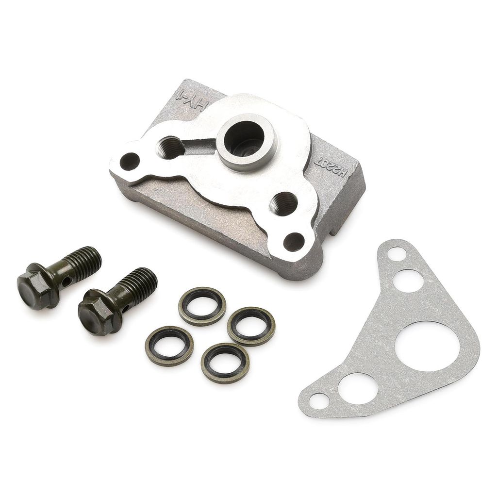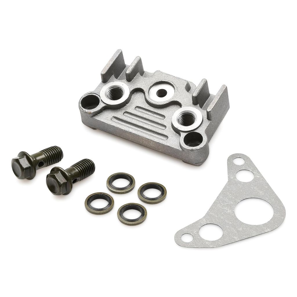 Adapterplatta / platta för att kunna koppla in slangarna från en oljekylare. Kontrollera vilken storlek det är på slangarnas anslutning / banjobultar som kommer från oljekylaren. Adaptorplattan passar motorer 125cc och 140cc som exempelvis Loncin, Lifan och YX.