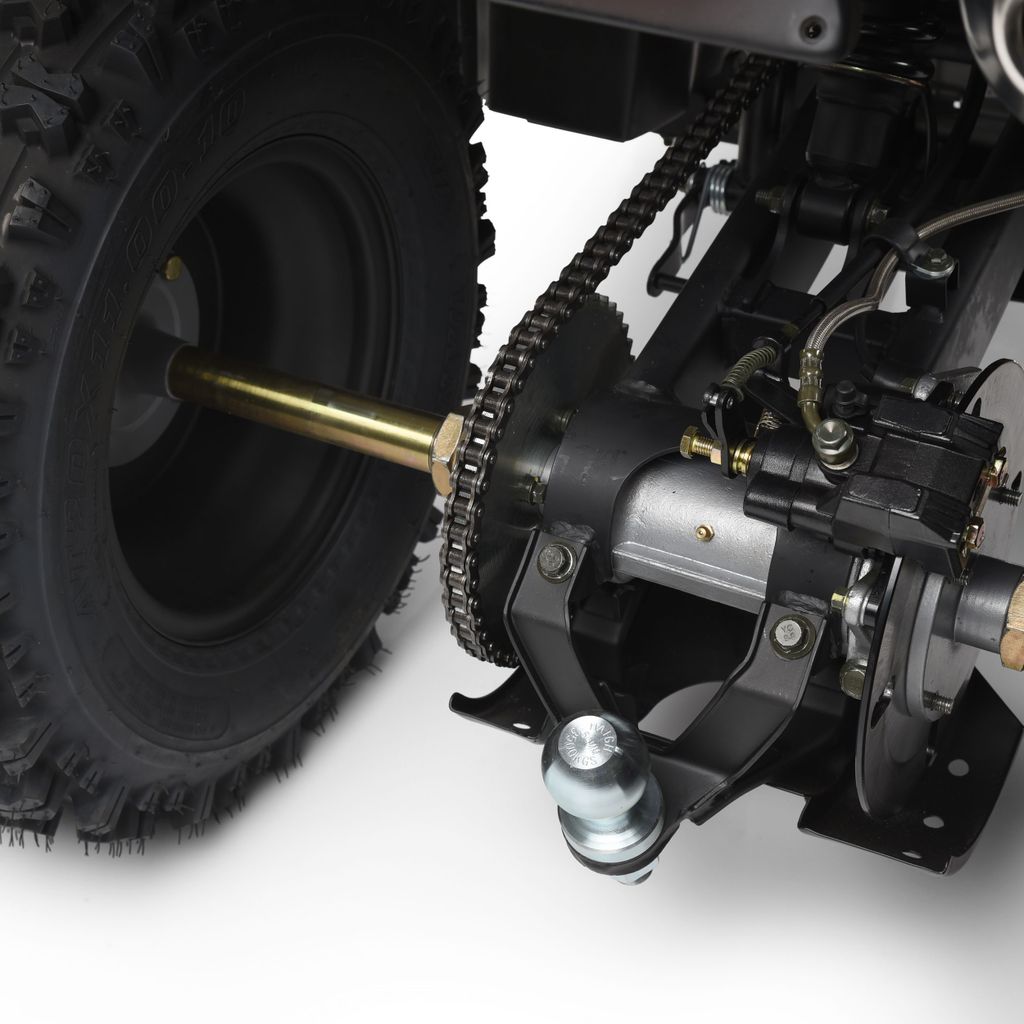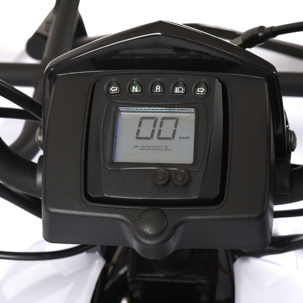 Hydrauliska skivbromsar finns både fram och bak, vilket ger kraftfull bromsverkan. På höger handtag sitter en parkeringsbroms, och fyrhjulingen har även ett 12-volts elsystem med elstart. En tydlig LCD-display visar hastighet och totalsträcka samt har bakgrundsbelysning och indikeringslampor för neutral, back, helljus och blinkers. Modellen har en bred, välstoppad sadel och ett styre som går att vinkla för bästa körställning. Den tåliga plastkarossen skyddar väl och pakethållaren bak ger ytterligare lastmöjligheter.