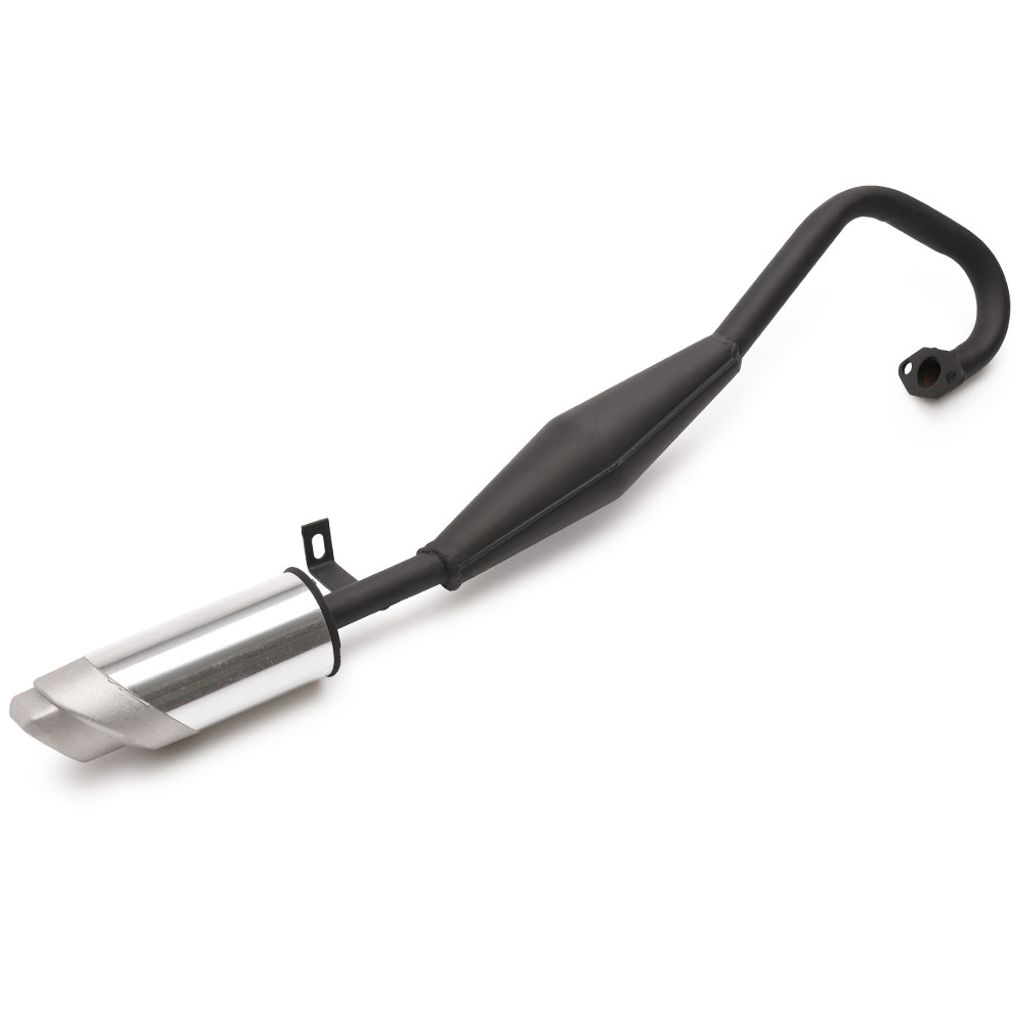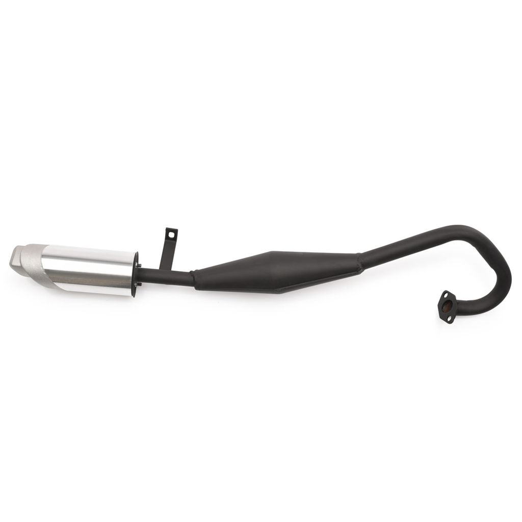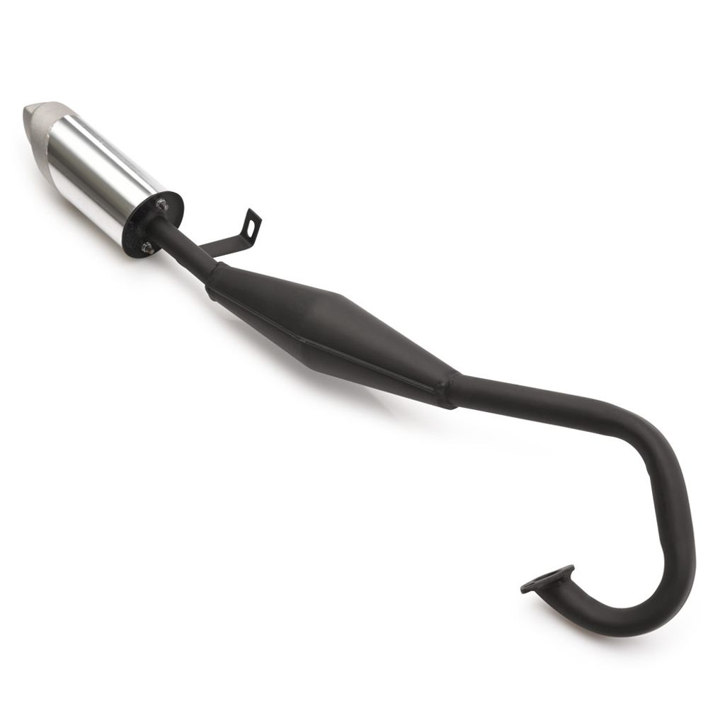 Avgassystem passande små lekfordon med 2-takts motor. Avgassystemet går ovanför motorn och rakt bakåt under sadeln vilket är typiskt för minimoto 39cc eller 49cc.