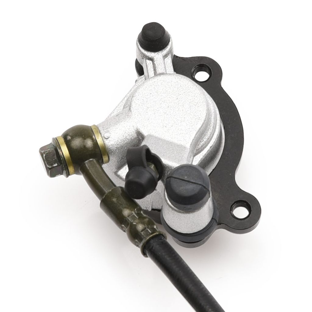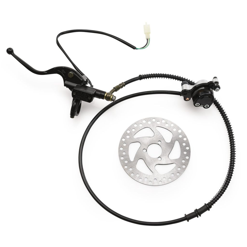 Hydrauliskt bromssystem bak med bromshandtag som monteras på vänster sida av styret. Bromssystemet är påfyllt och klart att användas. Passar mindre lekfordon som exempelvis minifyrhjuling / miniquad men kan även användas till mindre cross eller hobbyfordon. Bromshandtaget monteras på standard 22mm styre. Det finns även en brytare / bromskontakt i handtaget. Bromssystemet levereras inklusive bromsskiva som mäter 139mm i diameter.