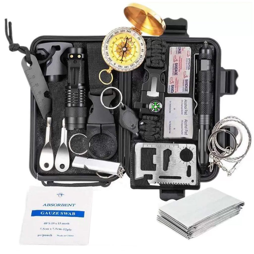 Detta bärbara överlevnadskit innehåller flera användbara redskap som hjälper dig att vara väl rustad ute i naturen. Kitet innehåller bland annat första hjälpen-material som bandage och alkoholpads, en robust kompass för enkel navigation, en slitstark nödfilt och en praktisk ficklampa för bättre synlighet i mörker. Med hjälp av det medföljande tändstålet gör du snabbt upp eld vid behov. Dessutom ingår ett multiverktyg och en nödsåg som kan vara avgörande i oväntade situationer. Detta kit passar perfekt för vandring, camping, jakt och andra utomhusaktiviteter där säkerhet är viktigt.