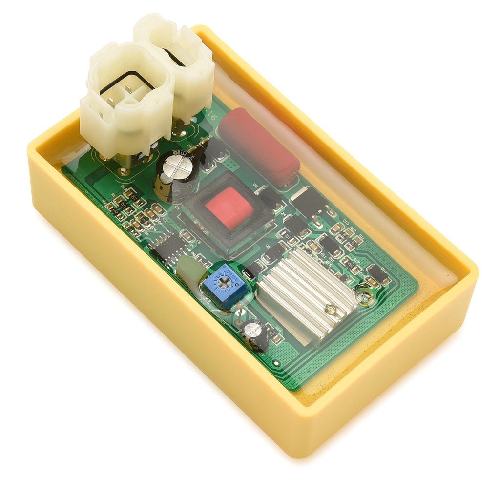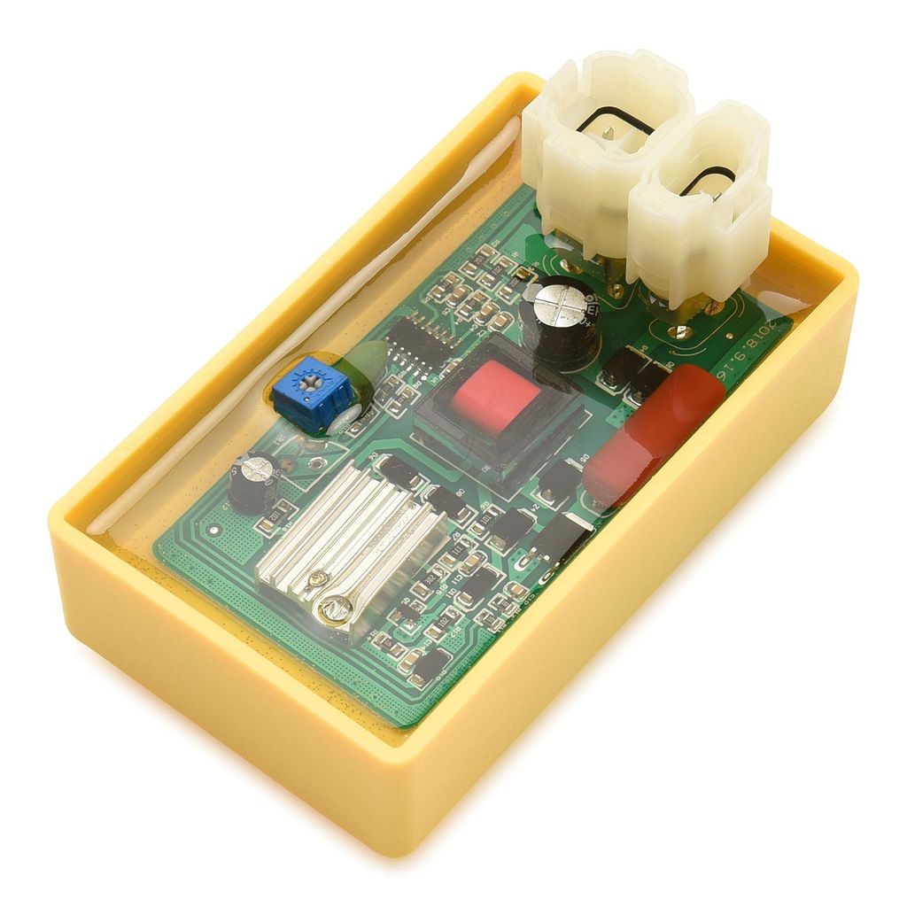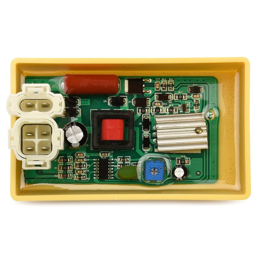 Trim CDI box passande 4-takts motorer av typen GY6 som är en motortyp med liggande cylinder och variator. Denna motortyp används i ATV / fyrhjuling samt moped / scooter 50cc, 70cc, 90cc, 125cc och 150cc 200cc. Anslutning med vit snabbkontakt (dubbelkontakt med runda hörn) enligt bild. Justerbar via en liten skruv (potenciometer) för att justera varvtal / varvstopp och på så sätt topphastighet.