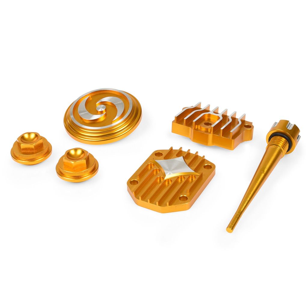 Styling / Dress Up Kit utav högsta kvalitet. Tillverkat av CNC fräst aluminium. Anpassat för motorer 50-125cc med runda ventilkåpor (O-ringar och packningar ingår ej, endast en O-ring till oljestickan).
