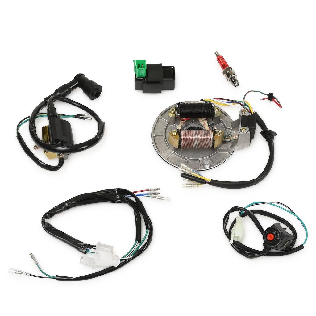 Elsystem Elkit med elkomponenter och kabelstam / kabelhärva anpassat för motorer med liggande cylinder och kickstart. Kompatibel med 50cc, 70cc, 90cc, 110cc, 125cc samt vissa 140cc och 150cc som använder denna typen av cdi box och tändplatta.
