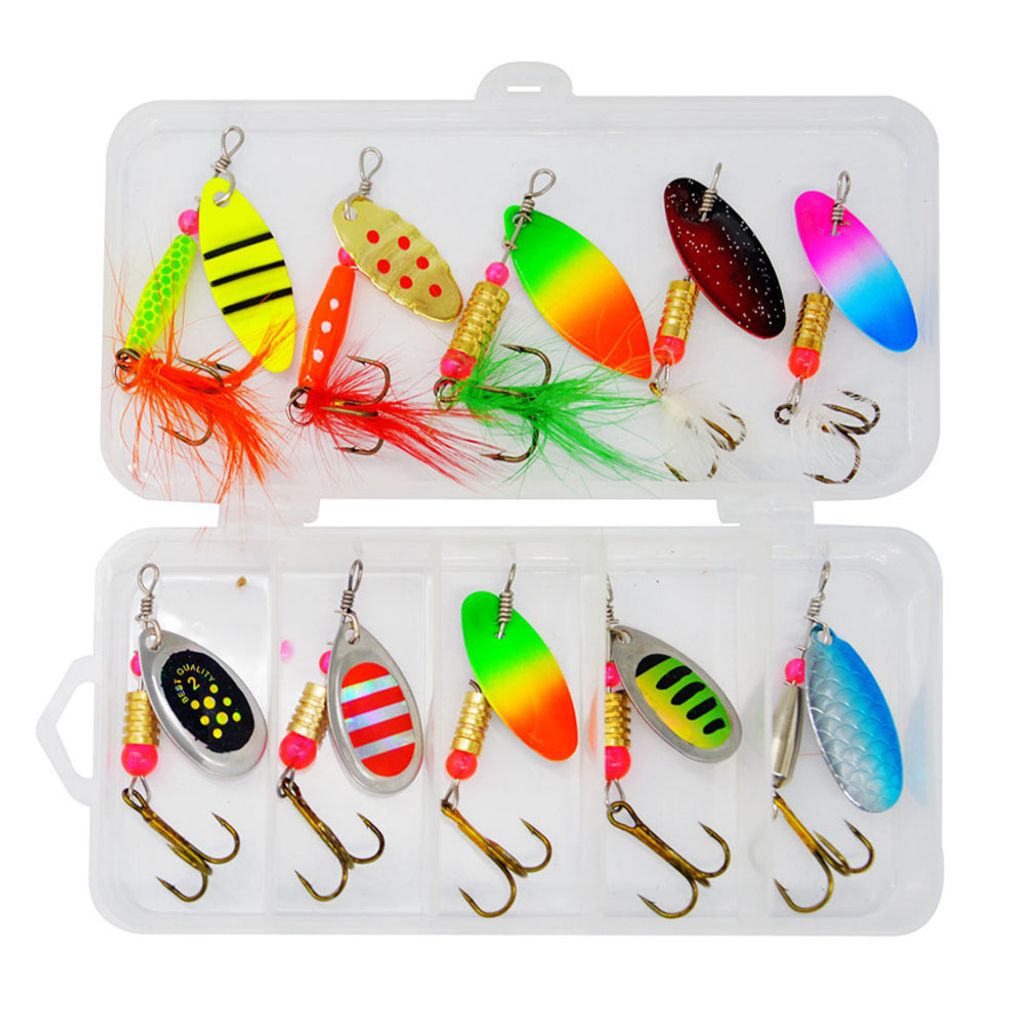 Ett praktiskt fiskedrag-set med 10 spinnare i olika färger och mönster, förpackade i en smidig förvaringslåda. Dessa spinnare är utformade för att passa fiske av gädda, abborre, öring och andra rovfiskar, både i sjöar och strömmande vatten.