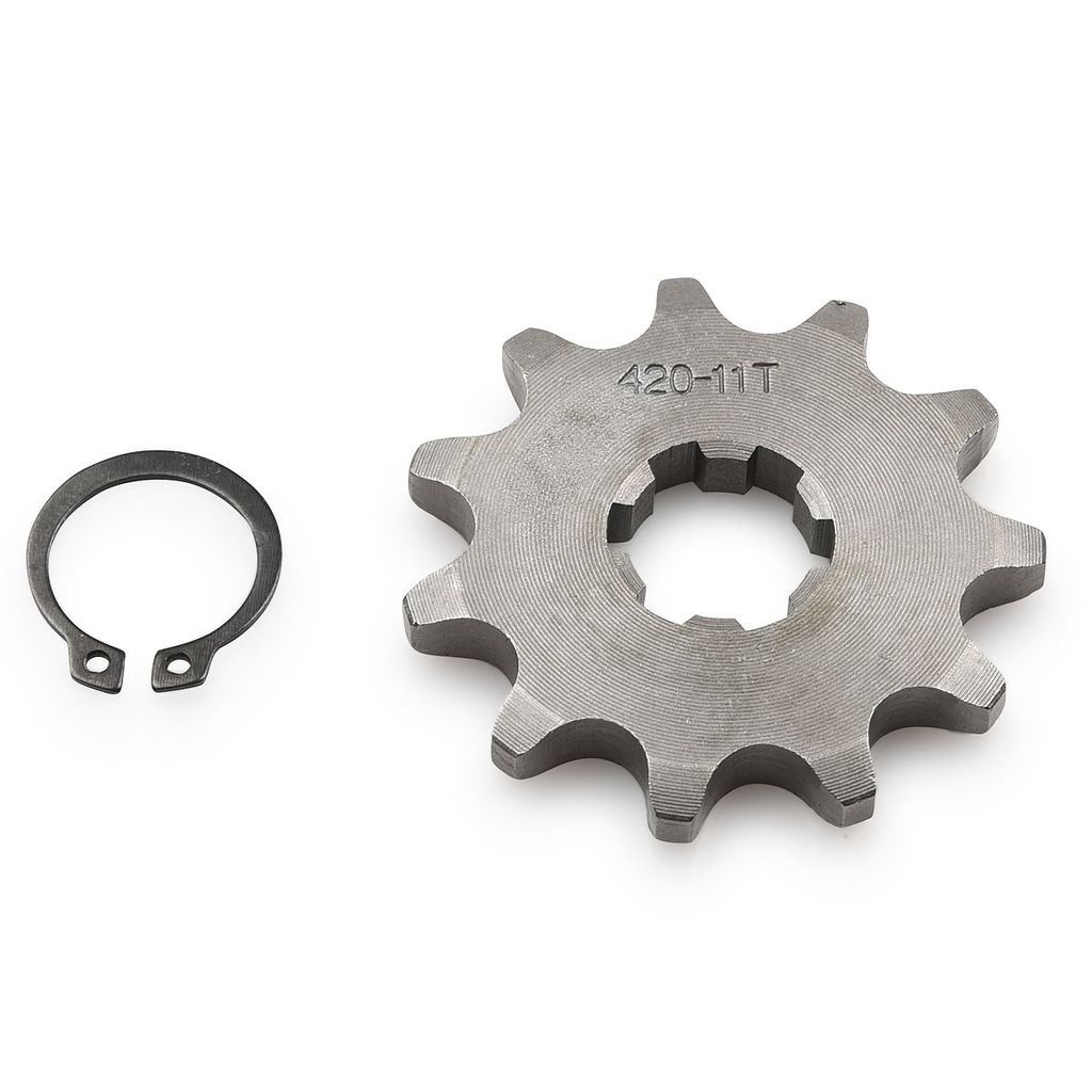 Framdrev utav hög kvalitet. Passande motoraxel 17mm och motorer med liggande cylinder exempelvis Lifan, Loncin, YX 70cc, 90cc 125cc samt även 140cc till 160cc där man föredrar att använda den något smalare kedjestandarden 420. Med ett litet drev på 11 kuggar är det viktigt att kontrollera så att kedjan inte kommer att gå emot svingen. Ett mindre framdrev ger maskinen mer styrka men lägre toppfart. Eftersom drevet är mindre i diameter levereras det med en låsbricka istället för drevlåsning med bultar. Kontrollera alltid måtten på ditt gamla drev och kedja innan beställning.