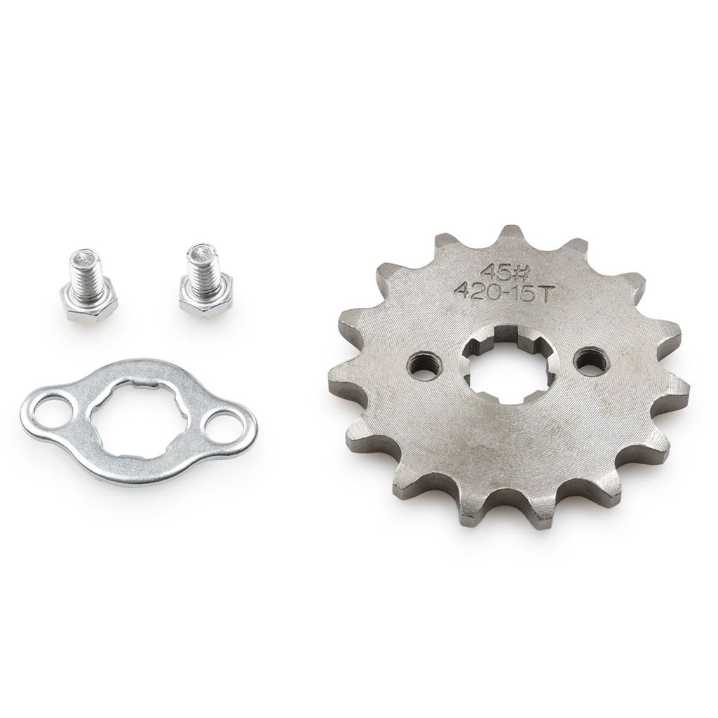 Framdrev utav hög kvalitet. Passande motoraxel 17mm. Anpassat för motorer med liggande cylinder exempelvis Lifan, Loncin, YX 50cc, 70cc, 90cc, 125cc samt även 140cc till 160cc där man vill använda den något smalare kedjestandarden 420. Levereras inklusive drevlås / fästplatta med bultar. Kontrollera alltid måtten på ditt gamla drev och kedja innan beställning.