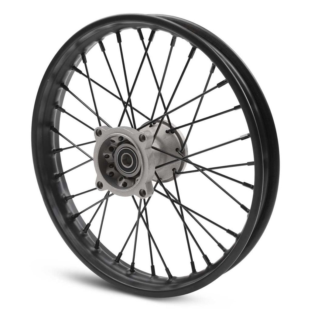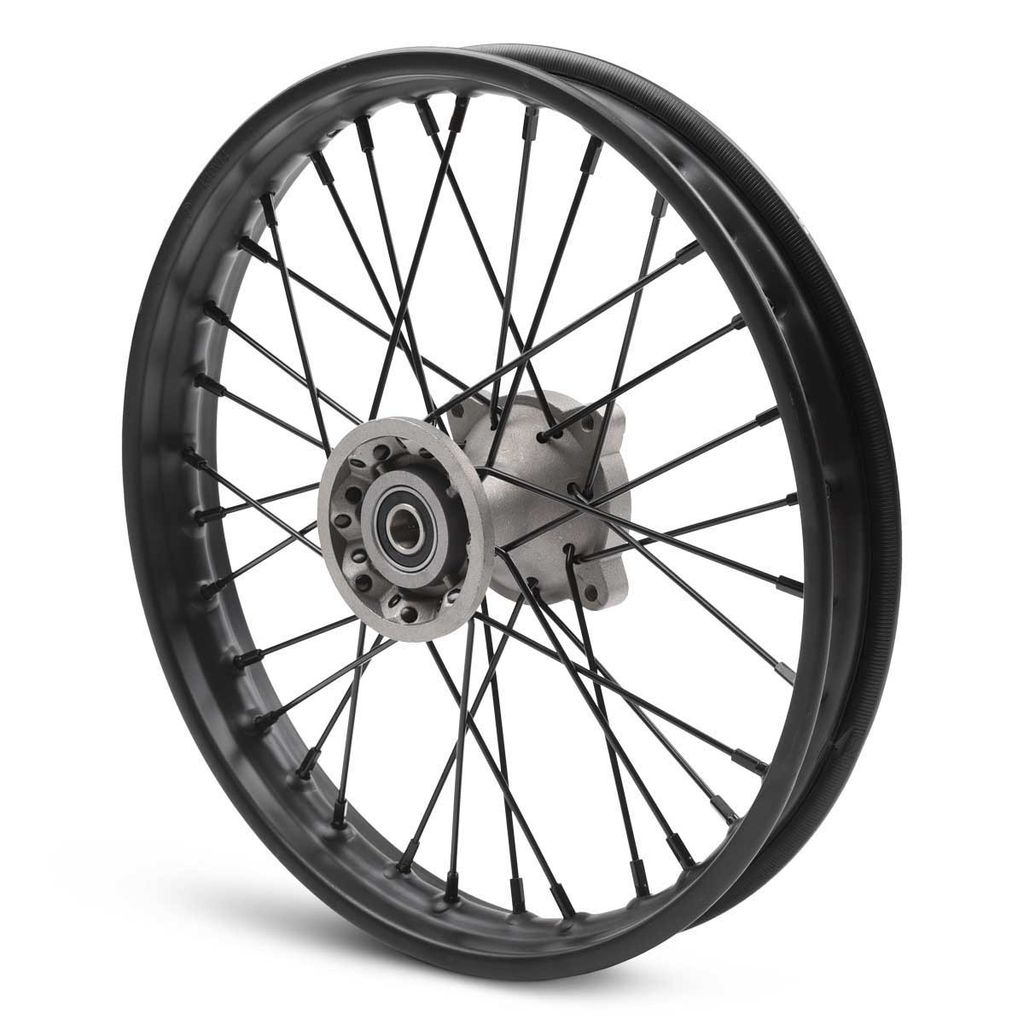 Kraftig fälg fram med fälgbana i stål samt nav i stark aluminium och rejäla kullager. Passsande ett flertal olika modeller av Dirt bike, cross / Fiddy med 15mm hjulbult / hjulaxel och 76mm centrum för bromsskiva.