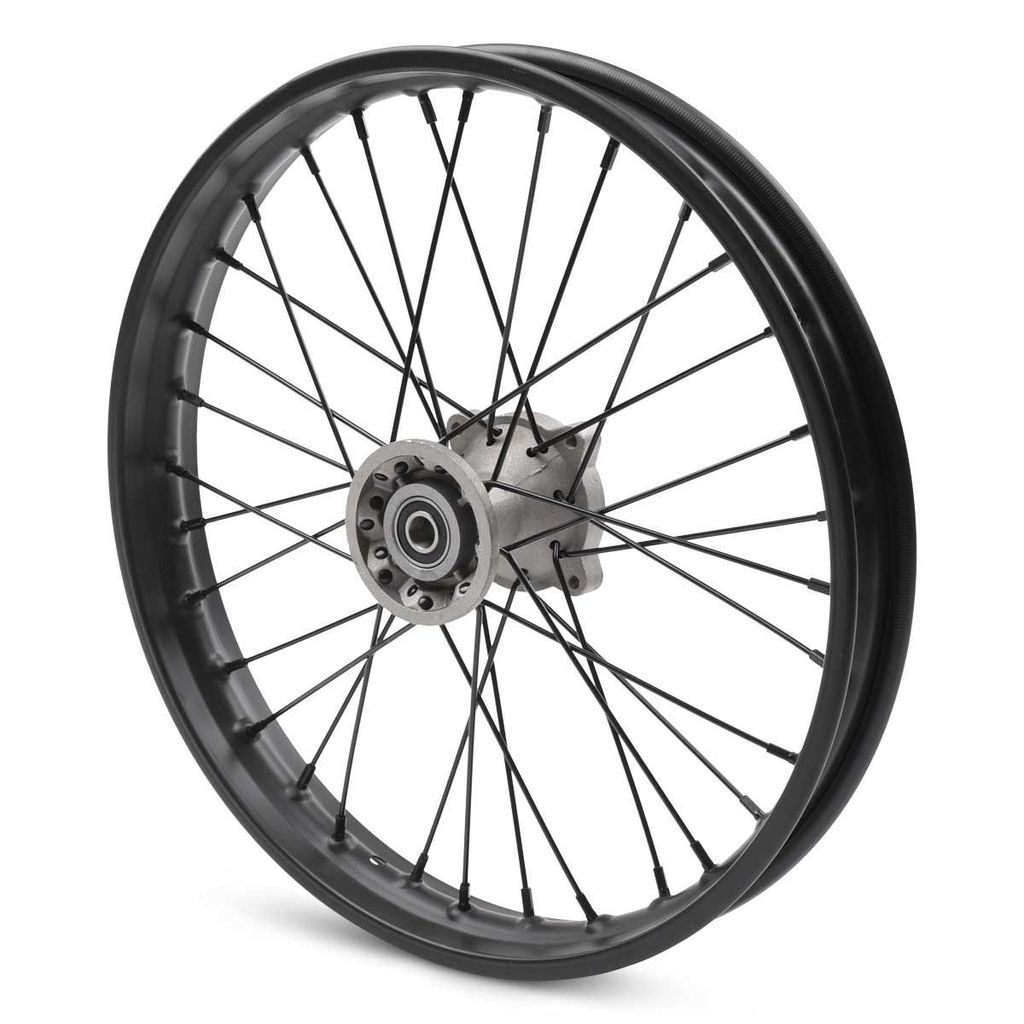 Kraftig fälg fram med fälgbana i stål samt nav i stark aluminium och rejäla kullager. Passsande ett flertal olika modeller av Dirt bike, cross / Fiddy med 15mm hjulbult / hjulaxel och 76mm centrum för bromsskiva.