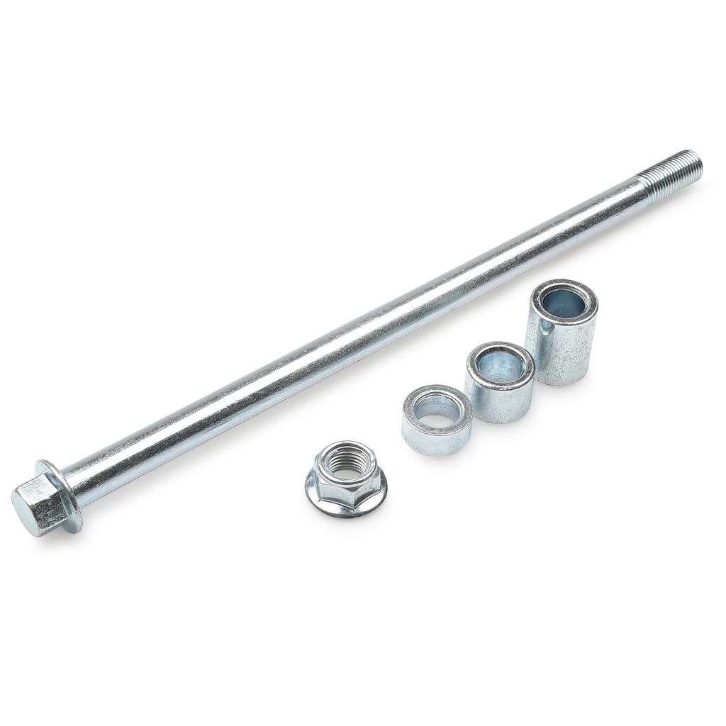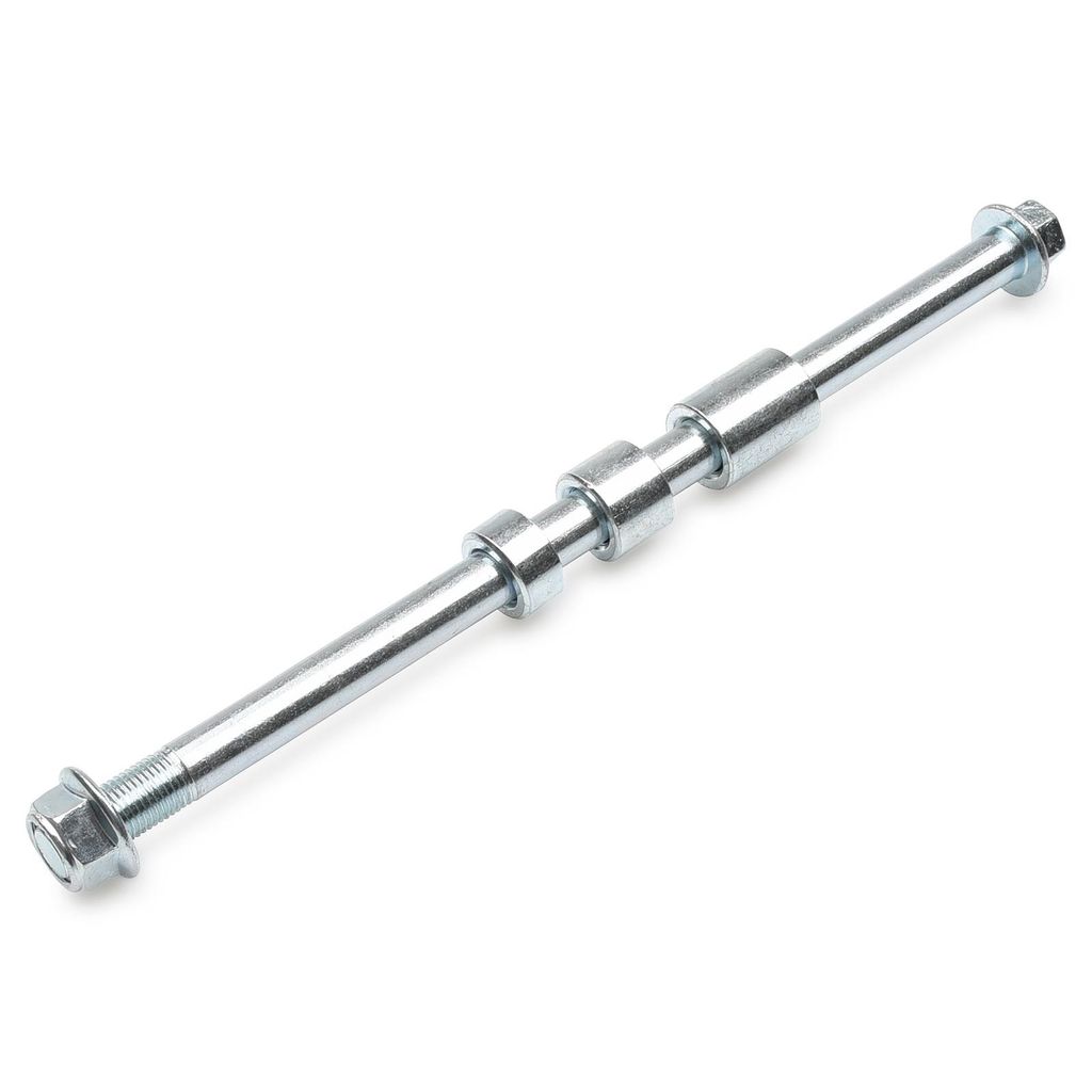 Hjulaxel / hjulbult 245mm lång och 12mm tjock. Inklusive mutter och 3 stycken olika distanser.
