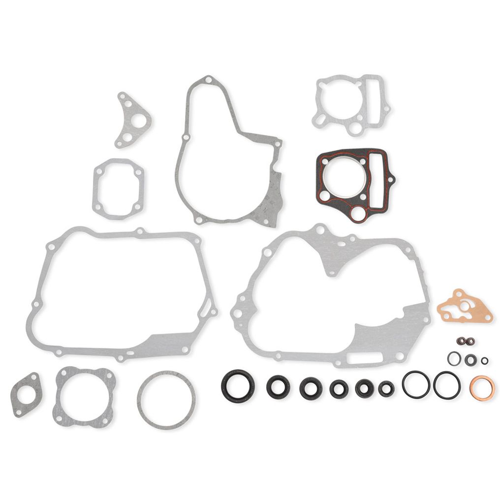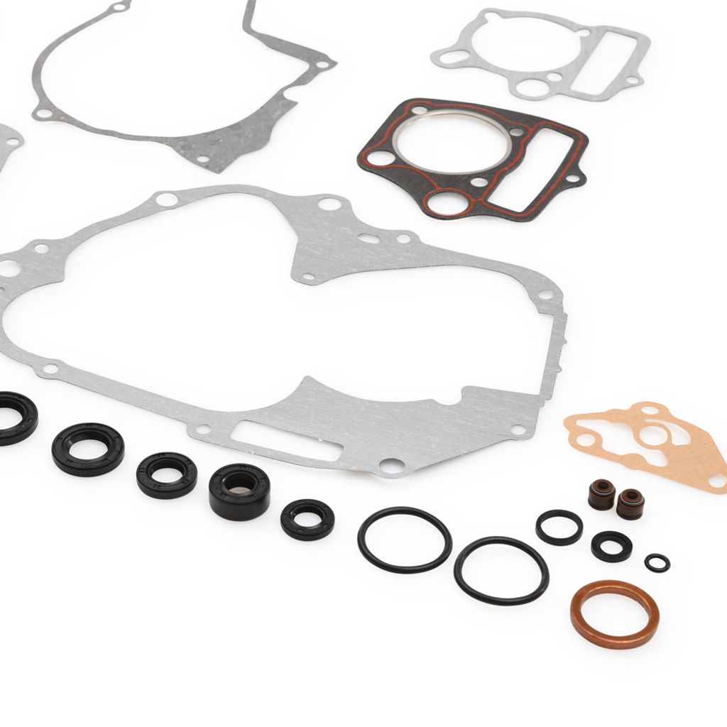 Komplett motorpackningssats med packboxar och O-ringar. Passande 110cc och 125cc 4-takts motorer med liggande cylinder och elstart (startmotorn placerad ovanför cylindern). Anpassade för 52,4mm kolv och cc 47 / 48 / 50,5mm. Packningssatsen innehåller alla packningar till motorn, bl.a packning till motorblock / motorhalvor, packning till vänster motorkåpa samt höger motorkåpa / statorkåpa. Kontrollera måtten på din gamla packning / avståndet mellan pinnbultar innan beställning. Det förekommer olika versioner med olika mått.