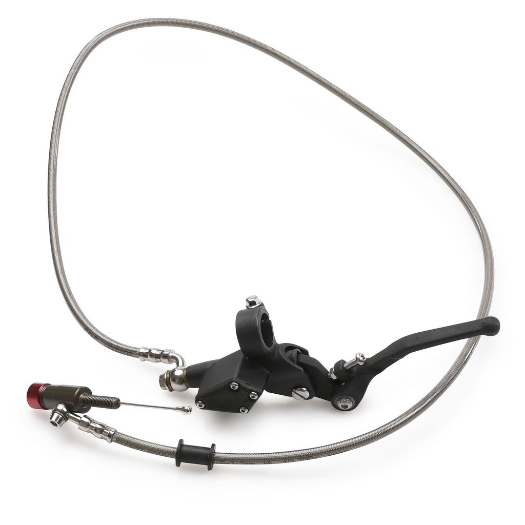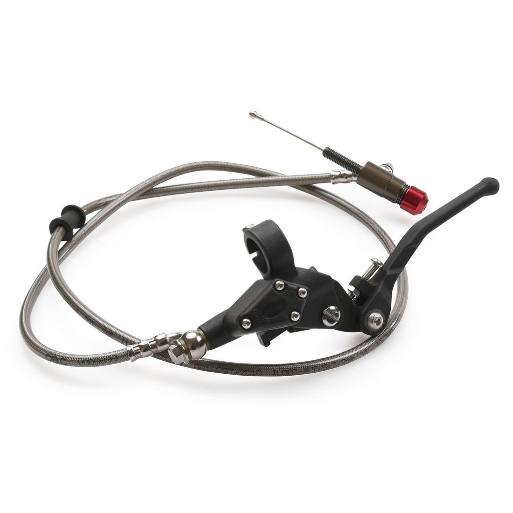 Hydraulkoppling för dirt bike / fiddy med fällbart kopplingshandtag för standard 22mm styre. Stålomspunnen hydraulslang på 1200mm. Anpassat för motorer med liggande cylinder och kopplingsarmen placerad på motorns ovansida. Vanligast bland 140cc, 150cc / 160cc och 190cc. Den hydrauliska kopplingen bidrar till en lättare manövrering och bättre känsla. Ställbart samt vikbart handtag / unbreakable.