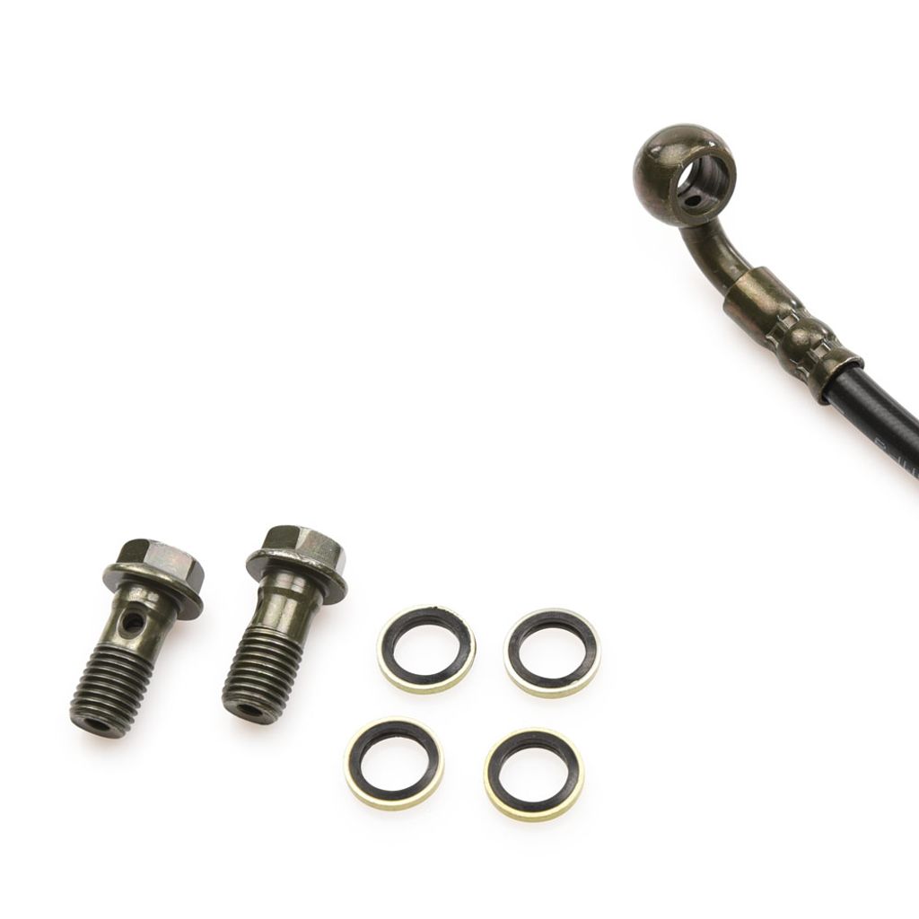 Kontrollera alltid längd och anslutningsbultarnas storlek. Inkl. 2 stycken banjobultar M10 och 4 stycken tätningsbrickor.