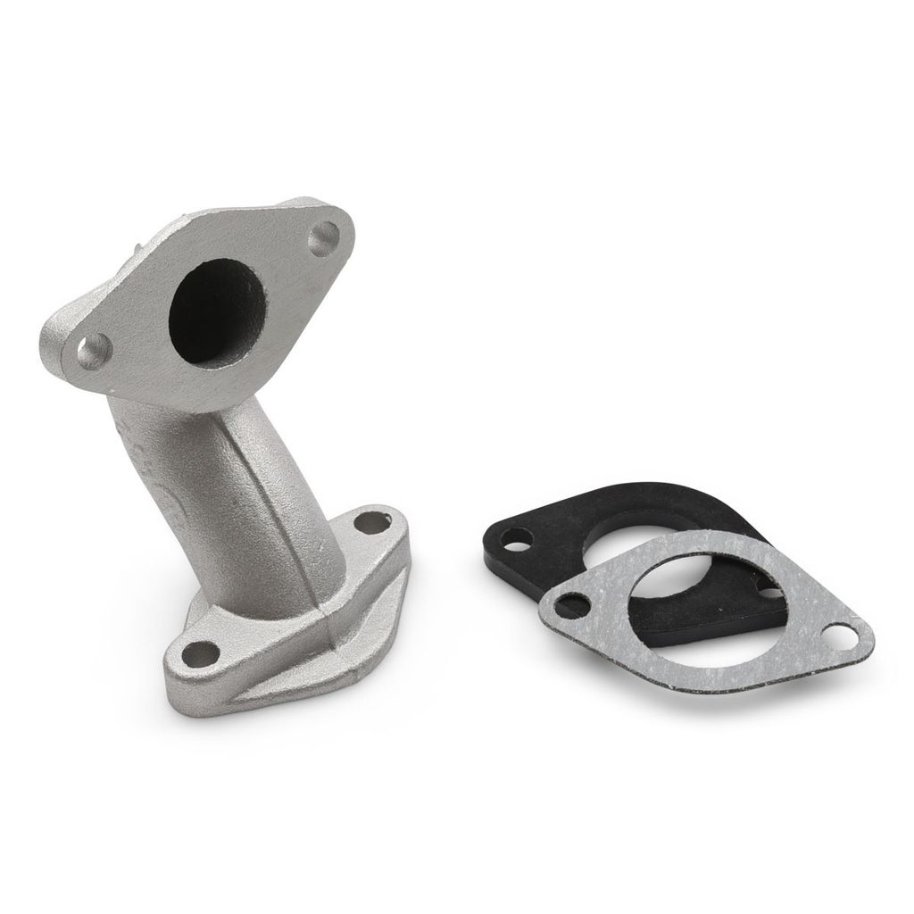 Insugsrör anpassat för 4-takts motor med liggande cylinder. Svängd modell även kallad svanhals vilket medför att förgasaren hamnar längre fram om det till exempel är trångt mellan insugsrör och startmotor. Lämpligt till motorer som Lifan och Loncin med en kubik på 50cc, 70cc, 90cc och som störst 110cc. Levereras med två packningar enligt bild.