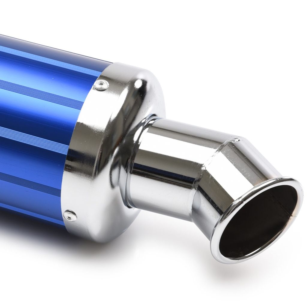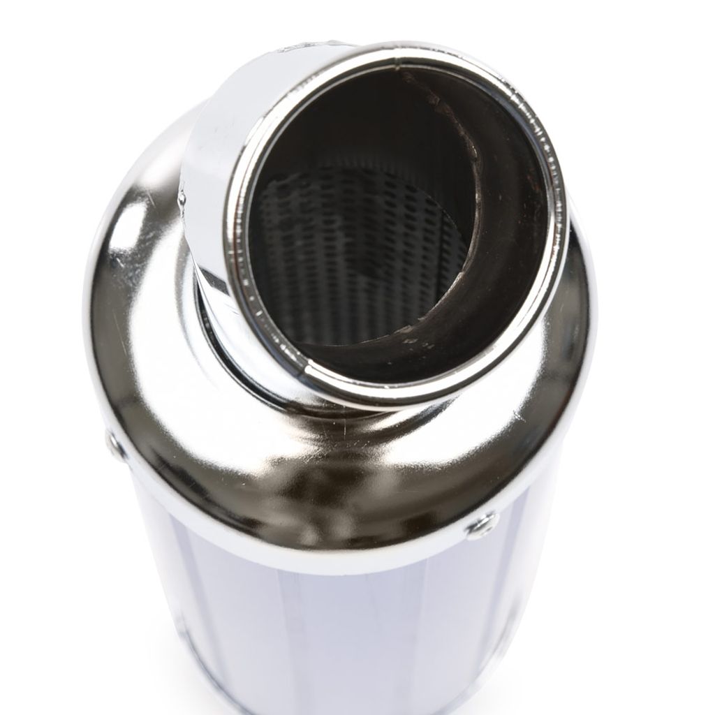 Snygg ljuddämpare i lätt och stark aluminium samt ändar i kromat stål. Levereras inklusive klämma / fäste ljuddämpare. För smidig anslutning krävs en anslutning / platta med 3 hål på avgasröret för att ljuddämparen ska kunna spännas fast.