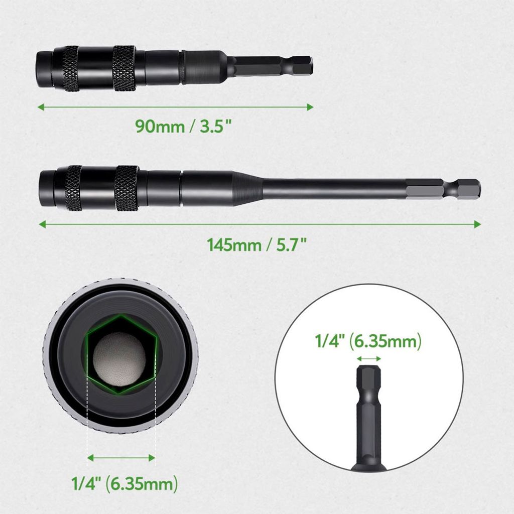 - Universell kompatibilitet: Passar alla 1/4" (6.35 mm) bits och skruvdragare.