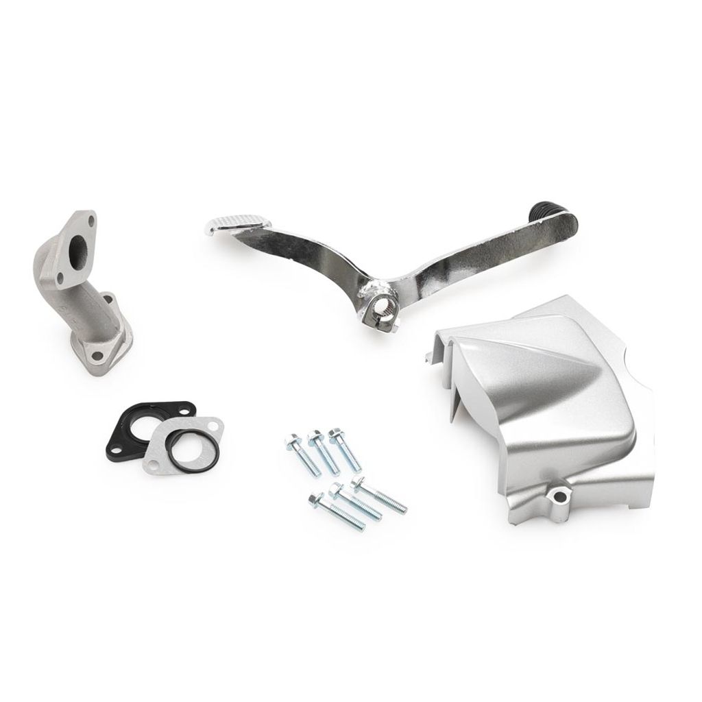 Det finns en oljesticka på höger sida för kontroll av motoroljan. Motorn levereras med sidokåpa för drevet, insugsrör med bultar och packningar, samt växelpinne. Utrustad med 15 tänders 428 standard framdrev.