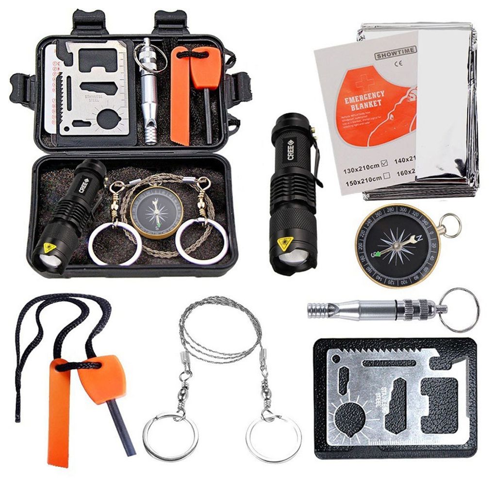 Beredskapskit med nödfilt, kompass och praktiska verktyg