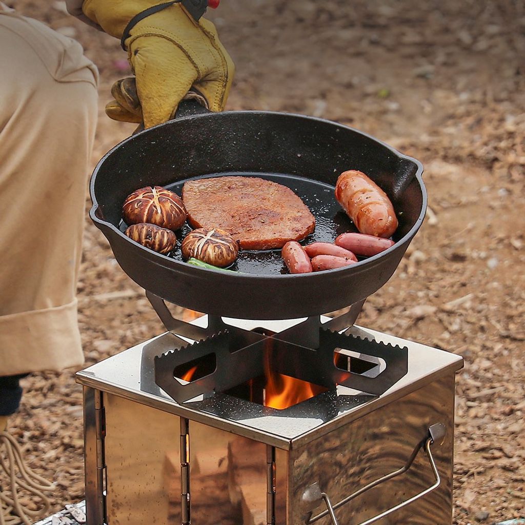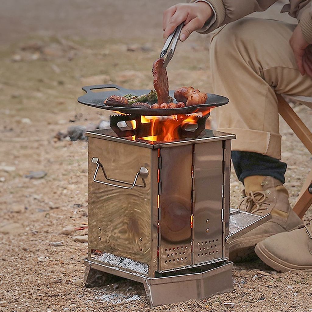 Denna portabla vedeldade kaminen i rostfritt stål är designad för att göra dina utomhusäventyr ännu bättre. Med en robust konstruktion och praktiska funktioner är den idealisk för matlagning och uppvärmning under camping, vandring och andra utomhusaktiviteter. Upplev enkel och effektiv matlagning i naturen med denna hållbara och lätta ugn.