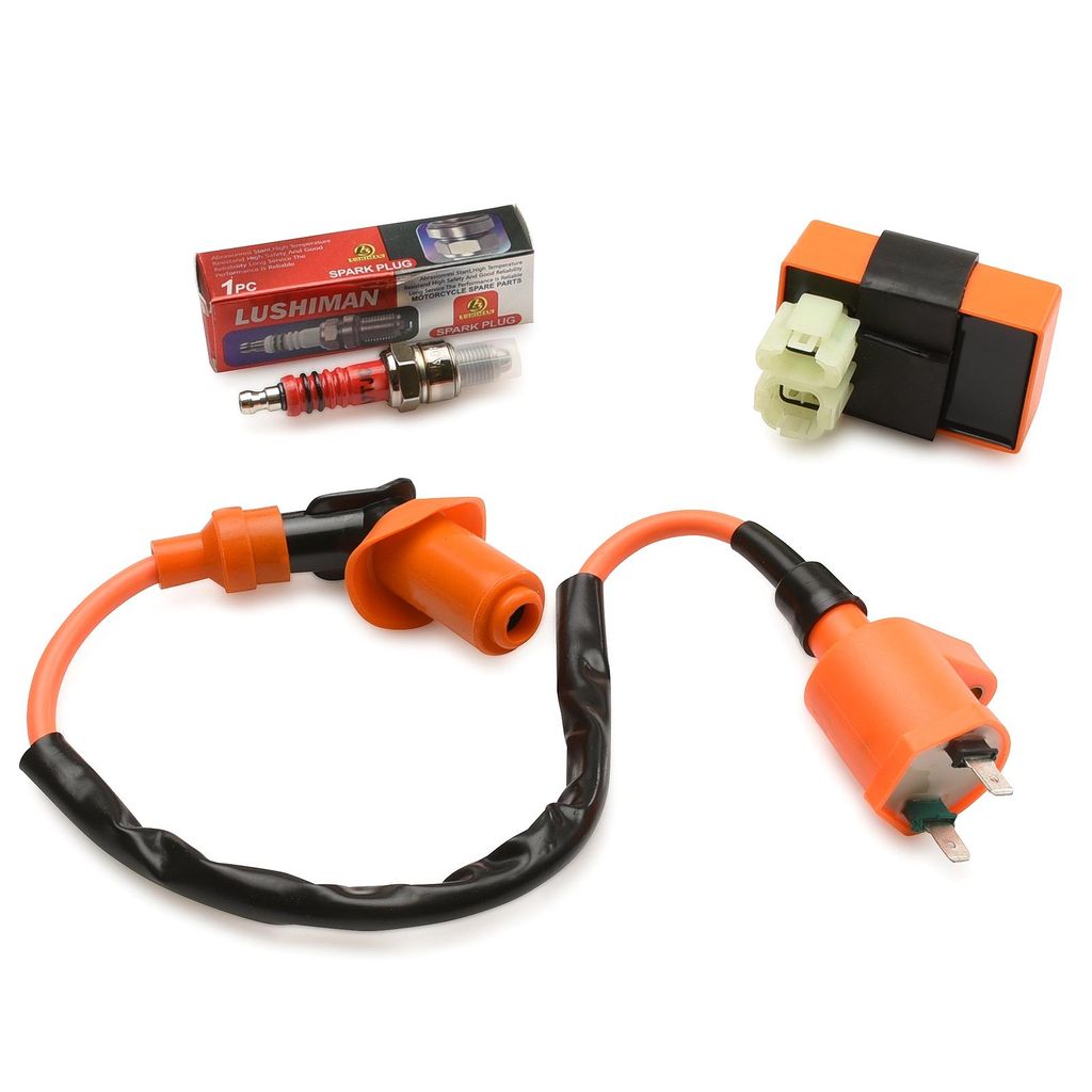 Racing kit inehållande trim / racing CDI box och tändspole samt tändstift. Passande 4-takts motorer av typen GY6 med liggande cylinder och variator. Denna motortyp används i ATV / fyrhjuling vanligast 150cc och 200cc samt moped / scooter 50cc, 70cc, 90cc, 125cc och 150cc. Anslutning med vit snabbkontakt (dubbelkontakt med runda hörn) enligt bild. CDI boxen ger motorn en högre tändkurva vilket medför högre varvtal och därmed ökad effekt / toppfart.
