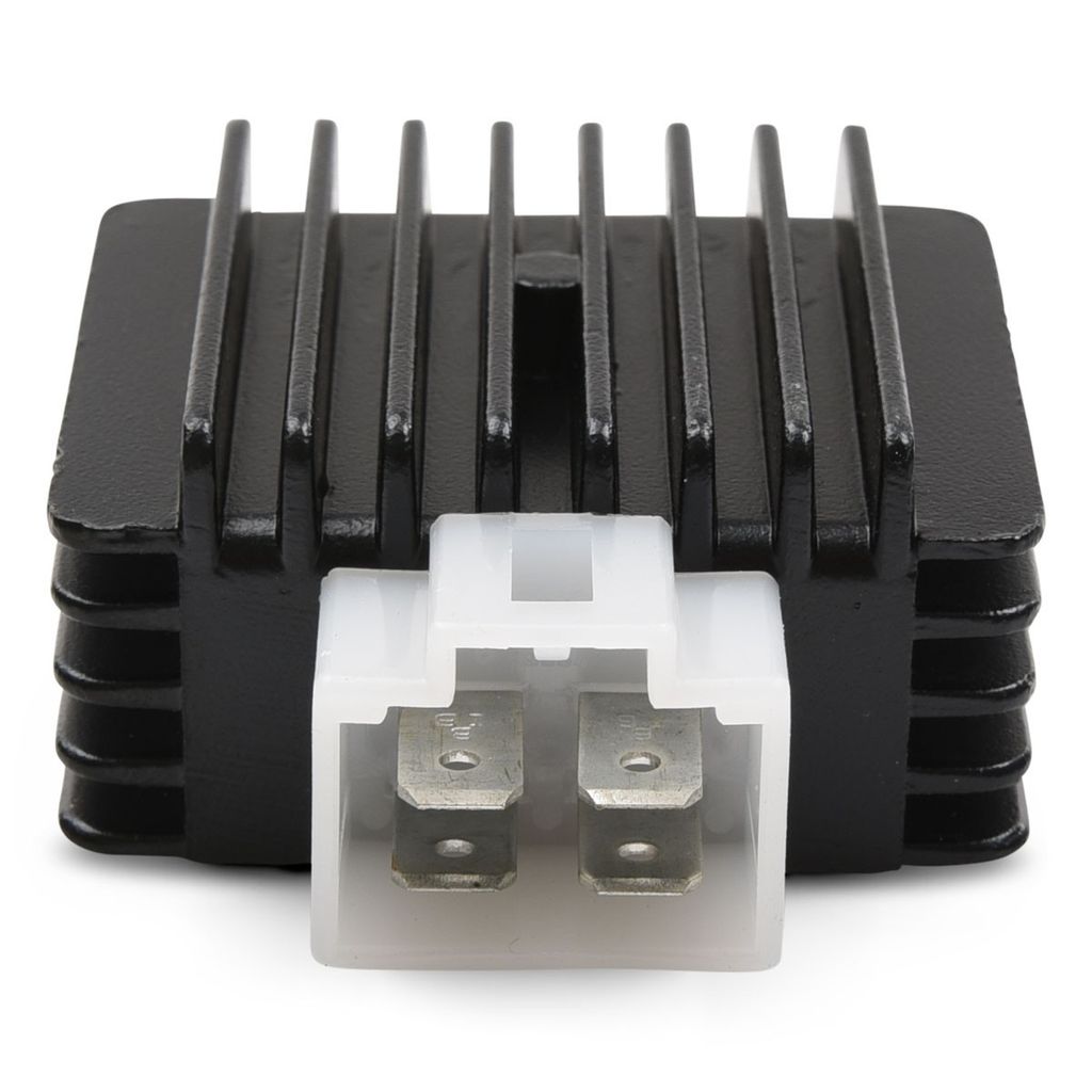 Spänningsregulator / laddregulator 12 Volt, omvandlar motorns växelspänning till likspänning för laddning av batteri och drivning av lampor. Vanligt förekommande på ATV / Fyrhjuling, scooter samt Cross Dirtbike / Fiddy med elstart. Anslutning med fyra flatstift. Passande en rad olika modeller och fabrikat som exempelvis Baotian, PGO, Apollo, Honda, Viarelli, Kayo, Goes, Loncin.