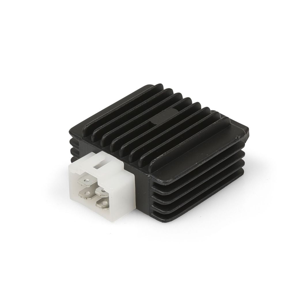 Spänningsregulator / laddregulator 12 Volt, omvandlar motorns växelspänning till likspänning för laddning av batteri och drivning av lampor. Vanligt förekommande på ATV / Fyrhjuling, scooter samt Cross Dirtbike / Fiddy med elstart. Anslutning med fyra flatstift. Passande en rad olika modeller och fabrikat som exempelvis Baotian, PGO, Honda, Viarelli, Kayo, Goes, Loncin.