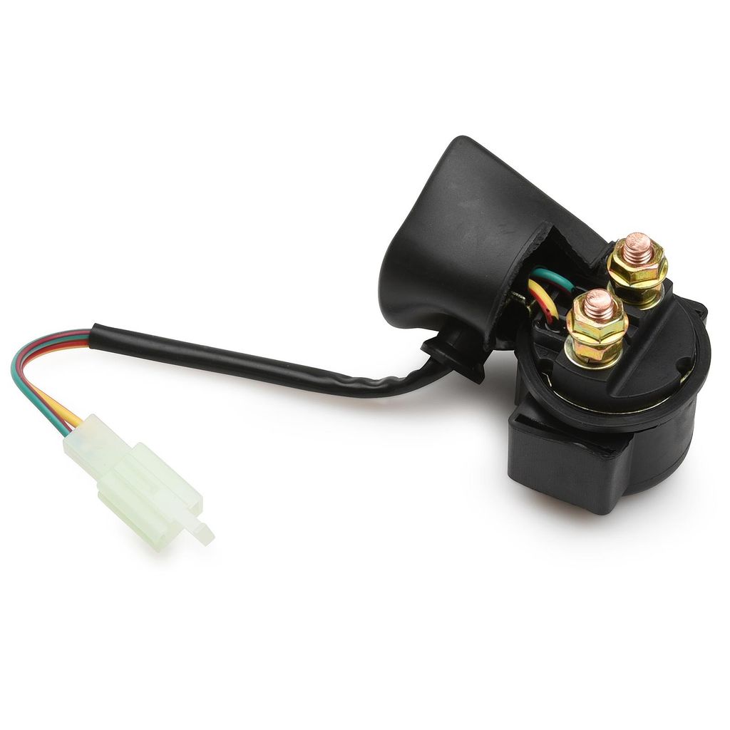 Universal startrelä utav hög kvalitet. Vanligt förekommande på fyrhjuling / ATV, cross / fiddy och scooter / moped. Praktiskt taget de flesta fordon utrustade med elstart i storlekarna 50cc, 70cc, 90cc, 110cc, 125cc, 150cc 200cc och 250cc, 300cc samt kan även passa större maskiner. Reläets styranslutning är en tvåpolig snabbkontakt, se bild.