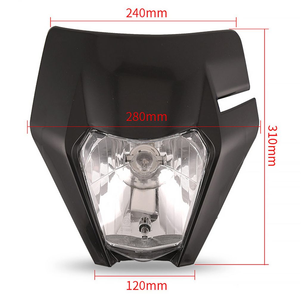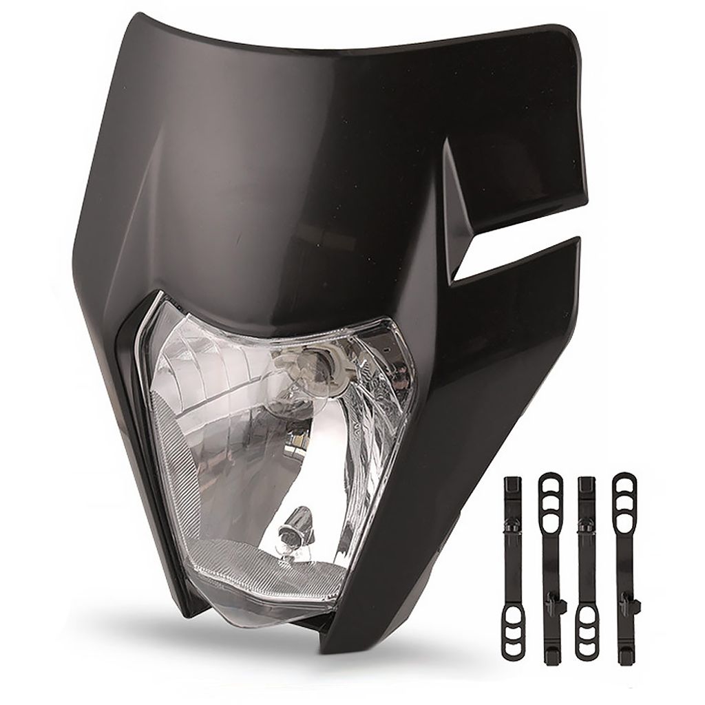 Strålkastare med framkåpa. Designen är inspirerad utav KTM. Universal modell som kan fästas på de flesta cross / enduro samt även mindre Dirtbikes.