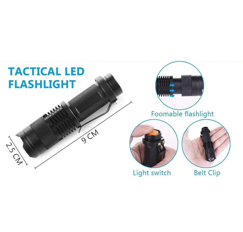 - Taktisk ficklampa (med tre ljuslägen och justerbar stråle)