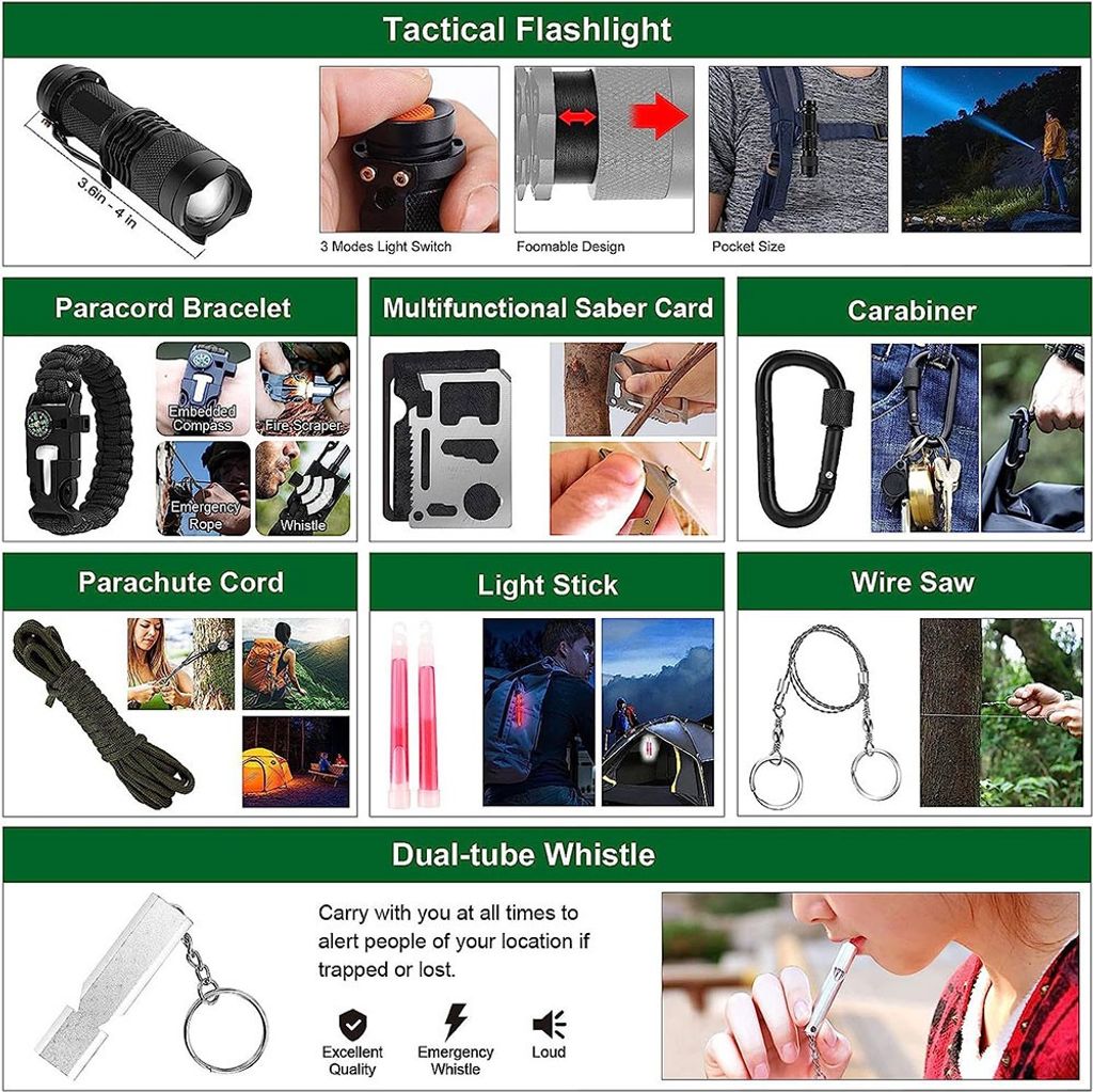 Oavsett om du är på äventyr i vildmarken, campar eller förbereder dig för nödsituationer, är detta överlevnadskit en pålitlig följeslagare. Med en mångsidig samling av robusta och praktiska verktyg, från eldstål och trådsåg till första hjälpen-kit och taktisk ficklampa, är du alltid redo att hantera utmaningar. Den slitstarka och kompakta väskan gör det enkelt att bära med sig all utrustning, vilket gör detta kit till ett måste för alla friluftsentusiaster.
