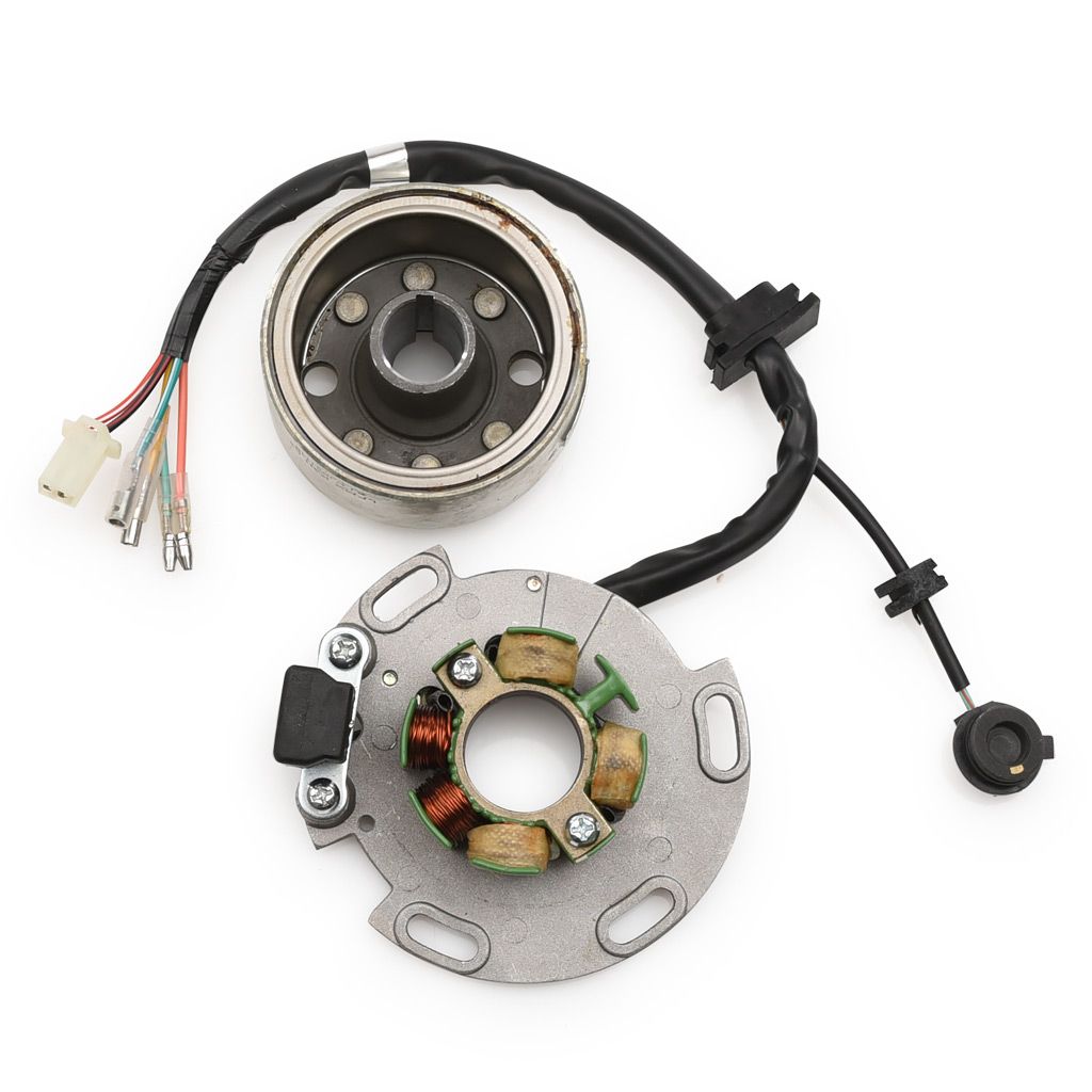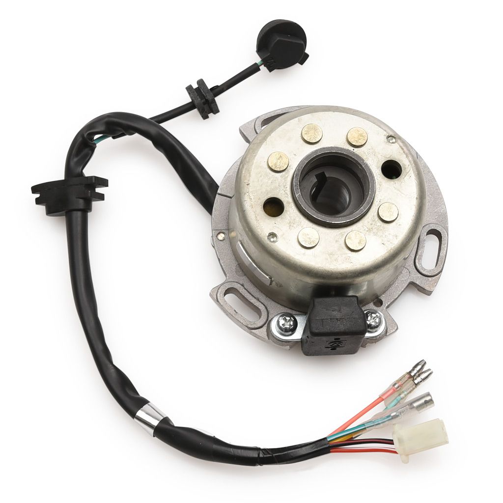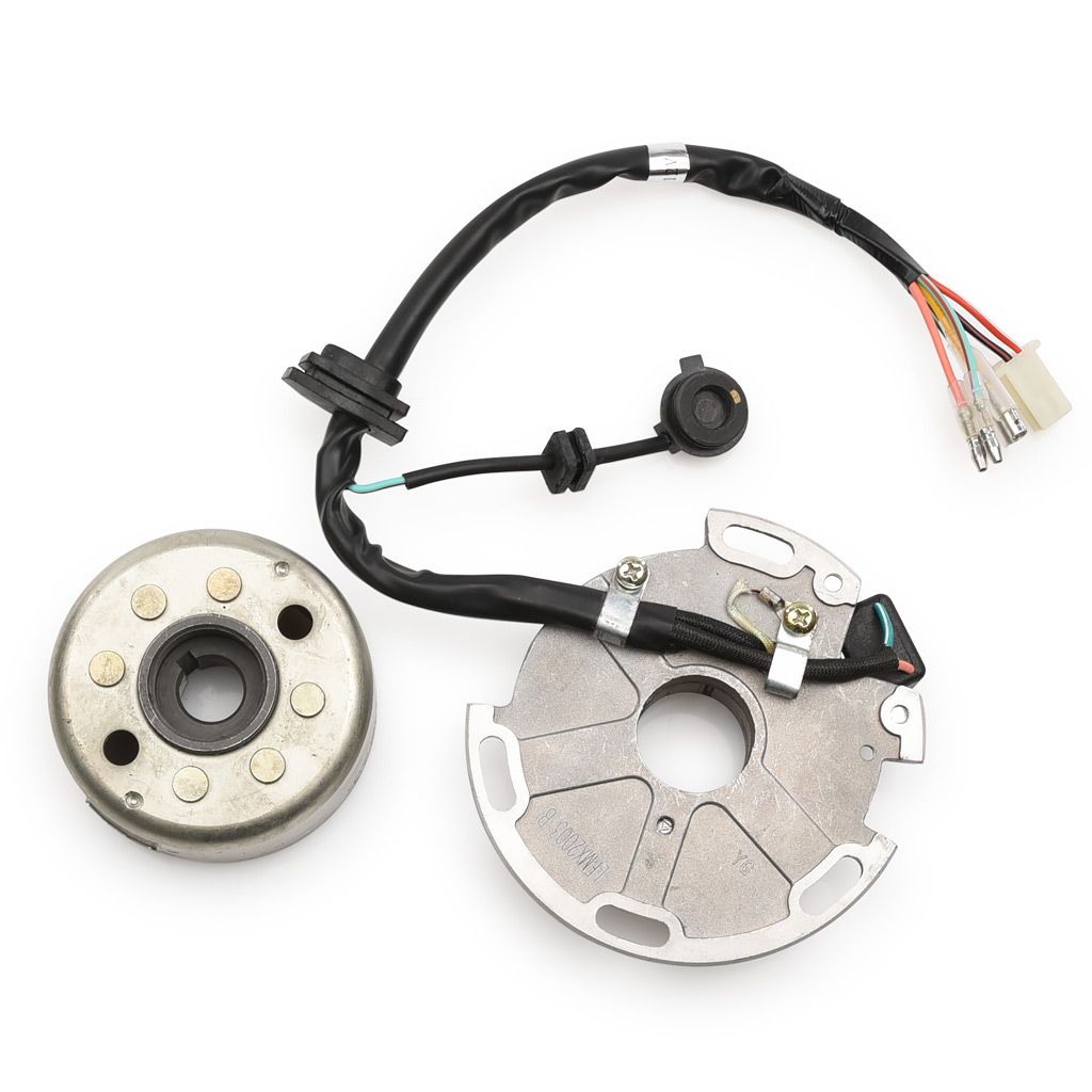Tändplatta / stator med 5 spolar och fast givare / pickup. Inklusive svänghjul. Anpassad för Lifan 140cc och 150cc. För att säkerställa rätt modell av tändplatta rekommenderar vi att öppna och kontrollera måtten.