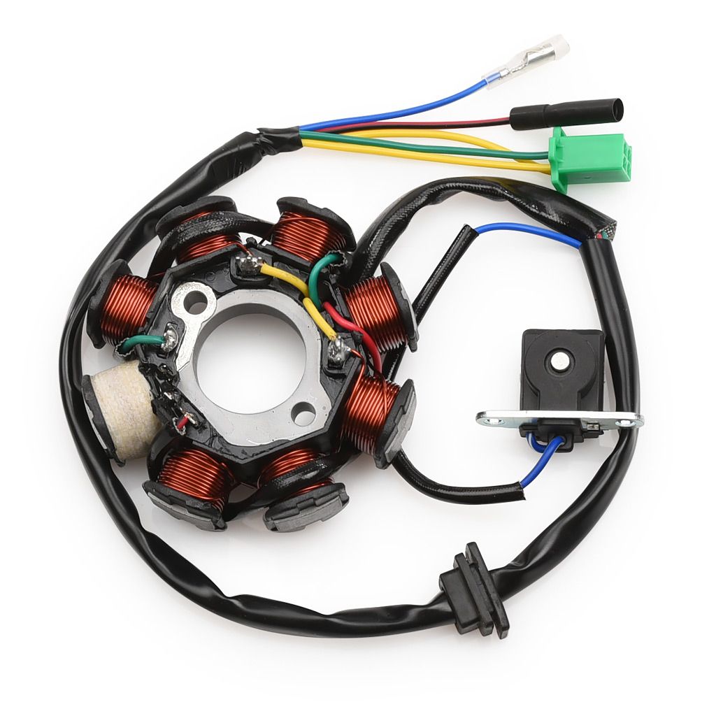 Tändplatta med 8 spolar och givare (lös pickup). Anpassad för Gy6 motorer med liggande cylinder vanligt förekommande på ATV / fyrhjuling med automatisk CVT drivning samt större scooter. Vanligast 125cc, 150cc, 172cc samt 200cc. Denna modell är monterad under höger fläktkåpa och under svänghjulet.