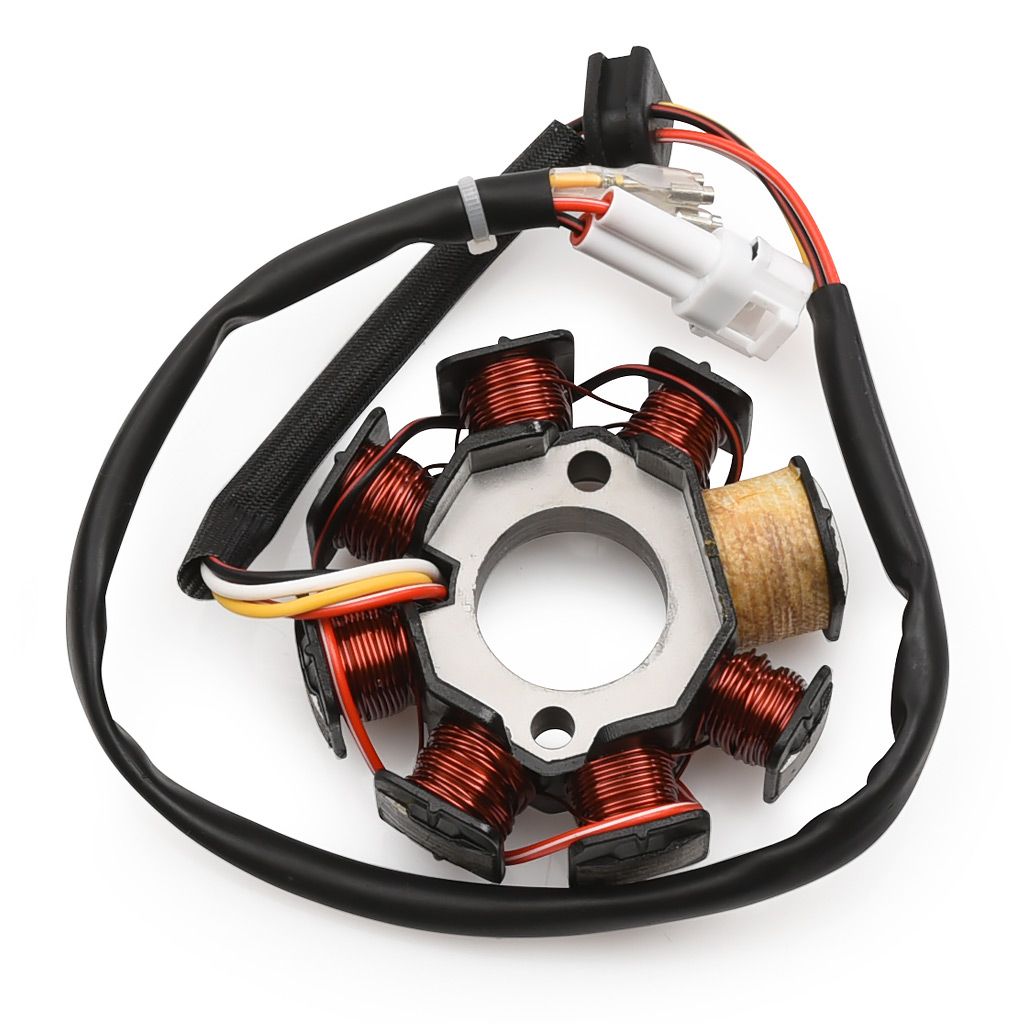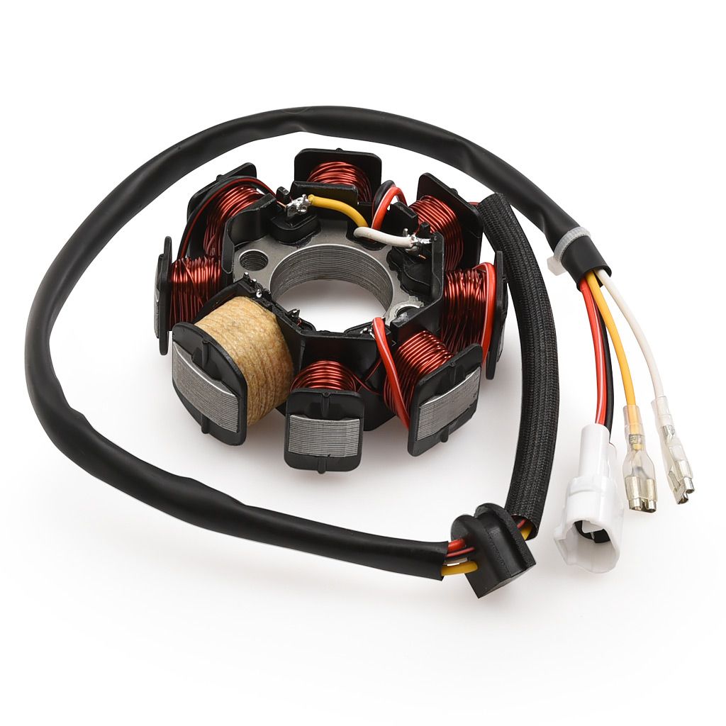 Tändplatta / stator med 8 spolar och utan givare / pickup. Anpassad för ett flertal olika KTM modeller som exc, excf, excr, excg, xcw, sx, mxc, mxcg, xc Tändplattan har 4 kablar. En 2-polig kontakt för laddning av cdi och 2 kablar med flatstiftskontakter för generatorn.